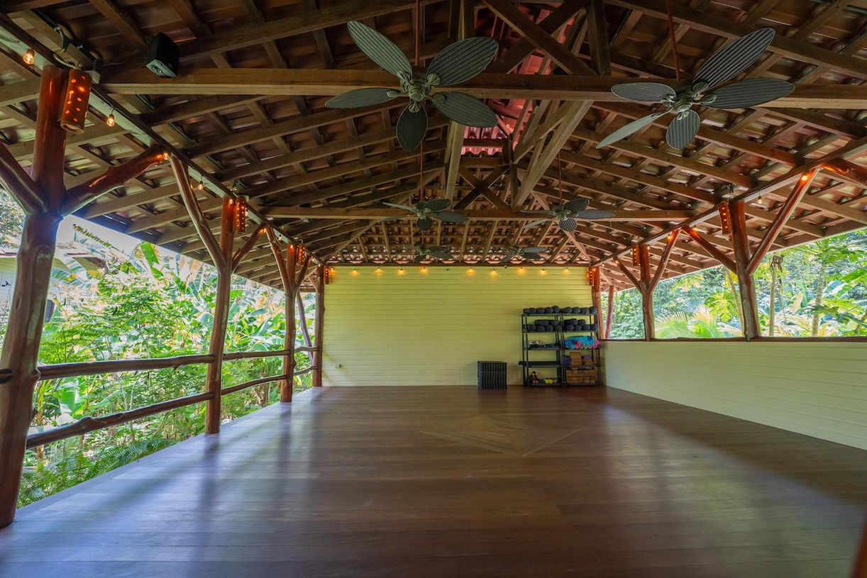 Open-air yoga shala with ocean views, wood flooring & space for 20+ participants